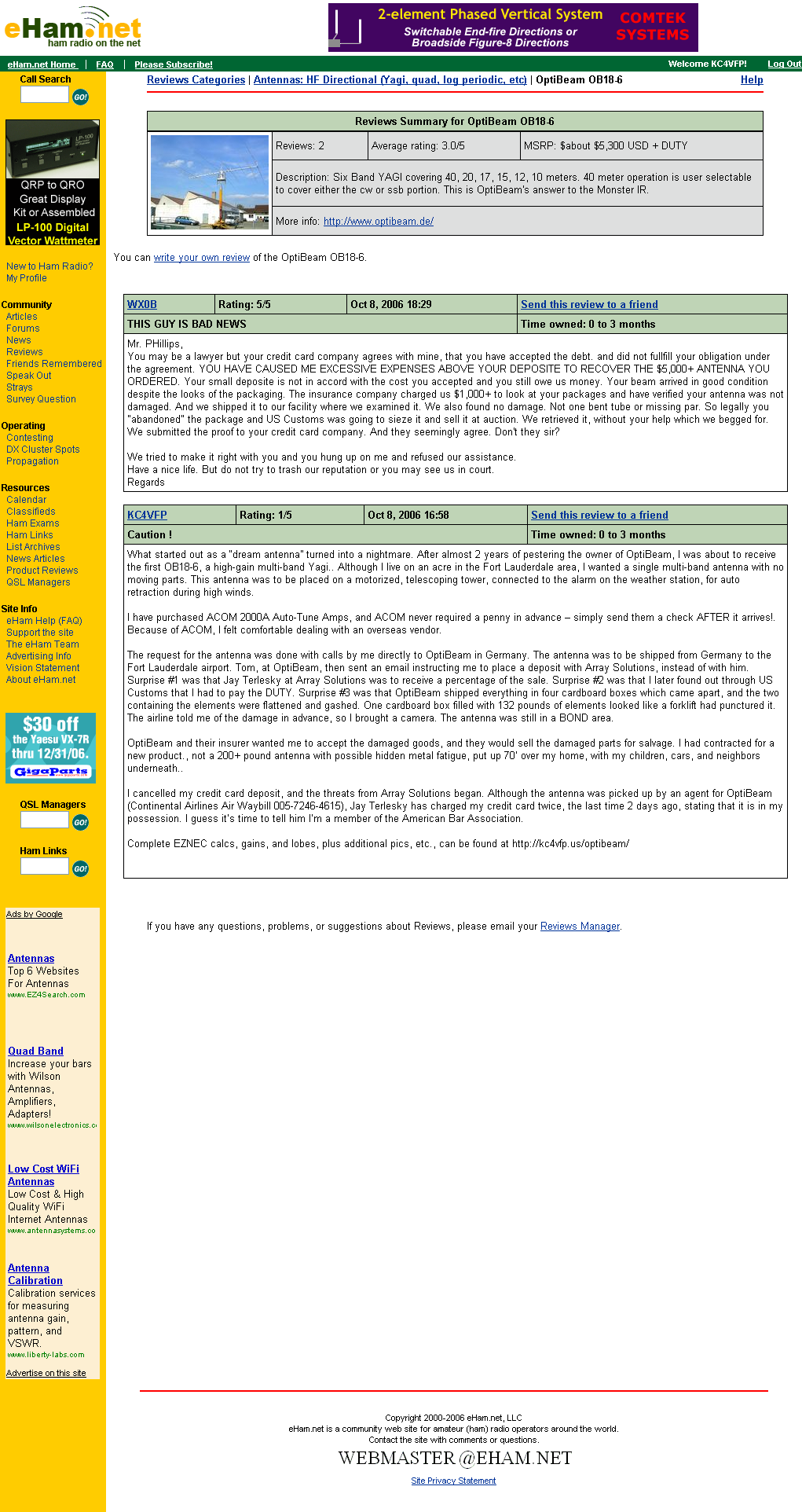 These are the reviews that OptiBeam and Jay Terleski, owner of Array Solutions, don't want you to see. This low rating review of a customer's experience was removed by EHAM.NET